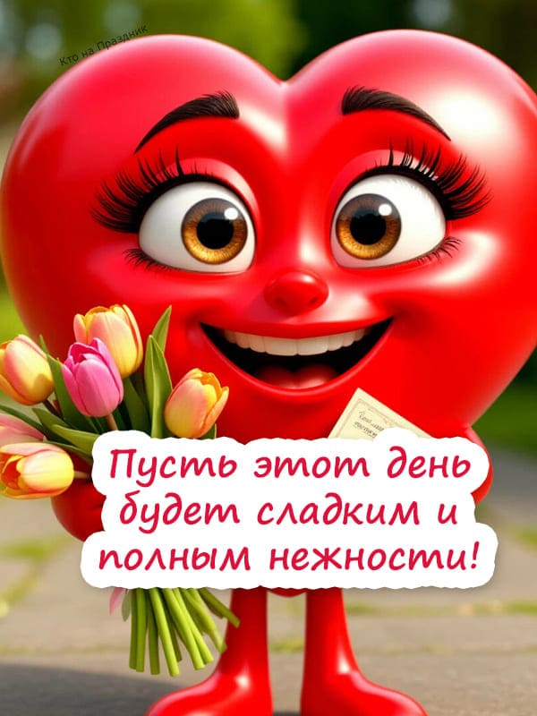 На открытке изображено большое красное сердце с милым лицом, которое держит букет тюльпанов, сердце улыбается, а на фоне видна зеленая трава, это изображение передает атмосферу праздника и любви на 14 февраля.