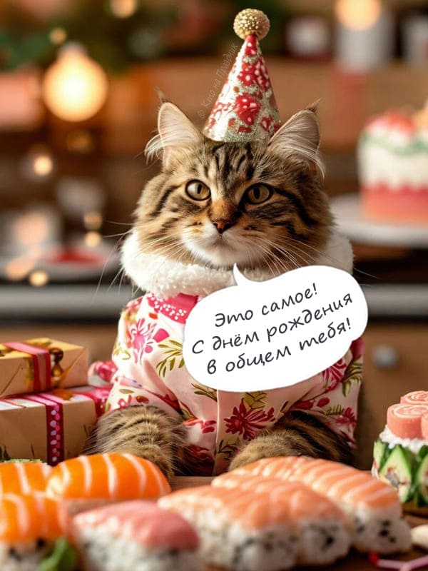 На открытке с поздравлением Днём рождения изображён полосатый, пушистый кот, да ещё серьёзный который одетый в костюм с узором в виде суши и праздничным колпаком, котик сидит на фоне праздничного столе где видны суши и коробки с подарками.