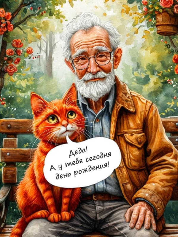 Открытка с днем рождения для дедушке с седыми волосами и бородой в очках. Он сидит на скамейке в саду, рядом с ним рыжий кот, вокруг них видны деревья и цветы создающие уютную атмосферу.