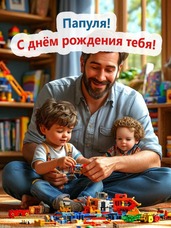 На праздничной картинке изображён мужчина с бородой и усами, он сидит на полу в светлой комнате с книжными полками на фоне, отец улыбается, играет с двумя сыновьями которые собирают разноцветные детальки конструктора, выше на открытке присутствует надпись: "Папуля! С днём рождения тебя!"