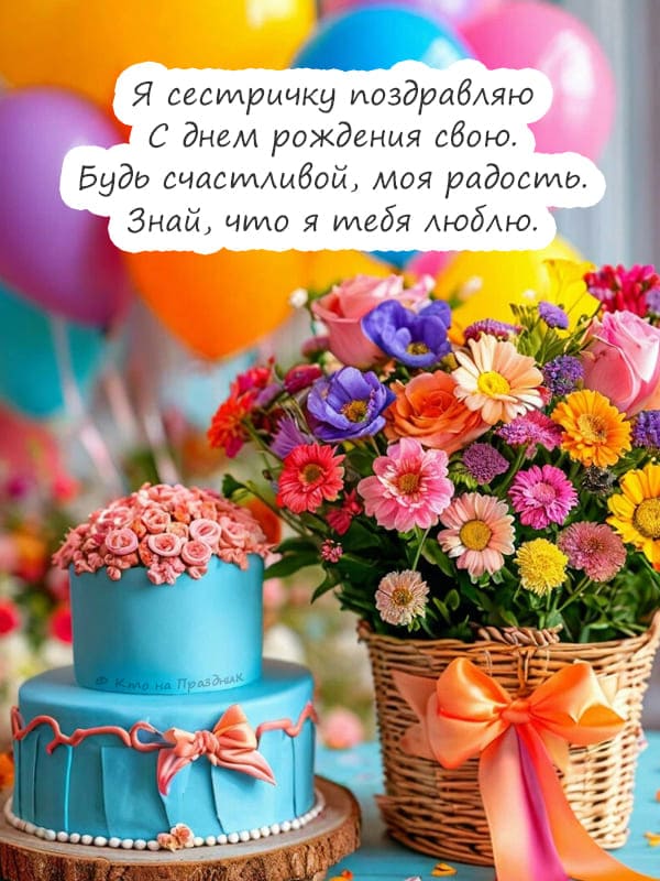 Добрые строчки стихотворения в виде поздравления на праздник любимой сестры её день рождения который бывает раз в год, на картинке на фоне размытых воздушных, разноцветных шаров стоит шикарный букет красивых цветов в плетённой корзине перевязанная бантиком, рядом березовый двух яростный торт с цветочками.