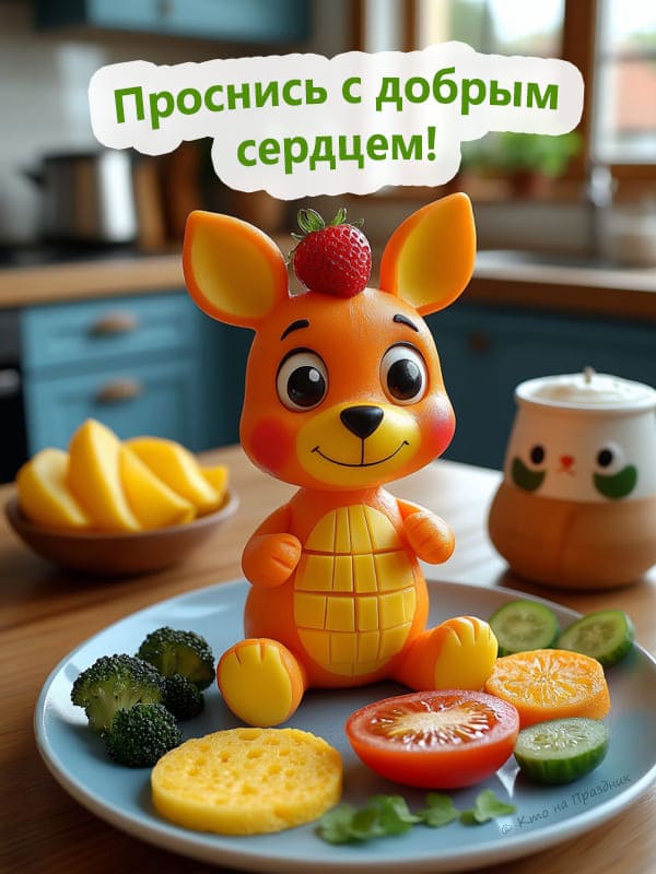 Картинка доброе утро необычная на которой изображена фигурка кенгуру, стоящего на тарелке с фруктами и овощами украшен ягодой клубники на голове, рядом с ним стоит кружка с молоком.