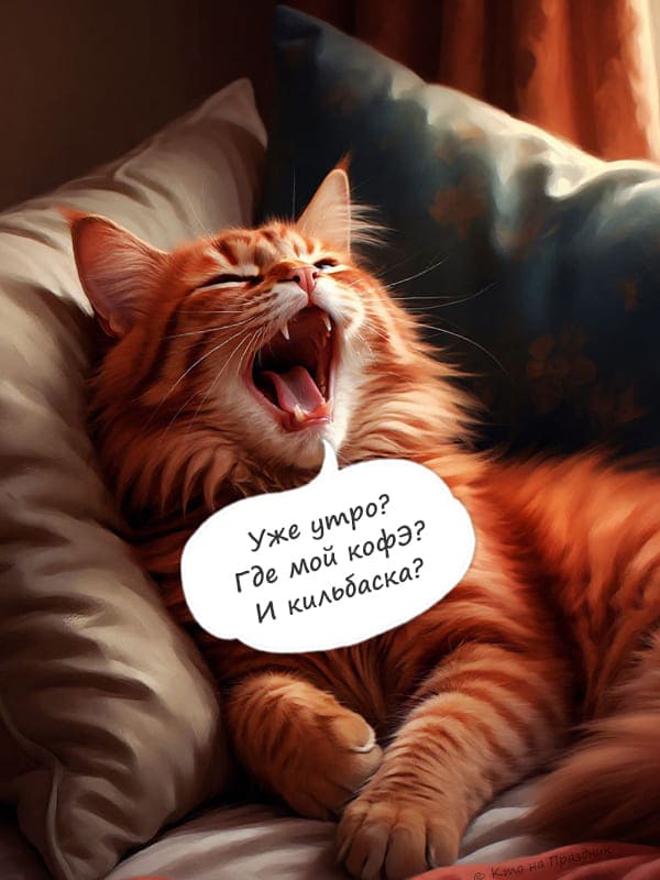 На открытки с добрым утром рыжий кот с пушистой шерстью лежит на подушках и зевает, а рядом с ним находится речевое облако с текстом: "Уже утро? Где мой кофе? И килбаска?".
