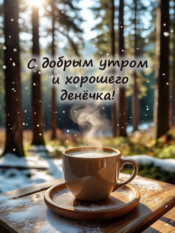 Открытка с добрым утром, на изображении видна чашка с горячим напитком из которой поднимается пар, чашка стоит на деревянной поверхности, а вокруг виден зимний лес с деревьями и снегом.