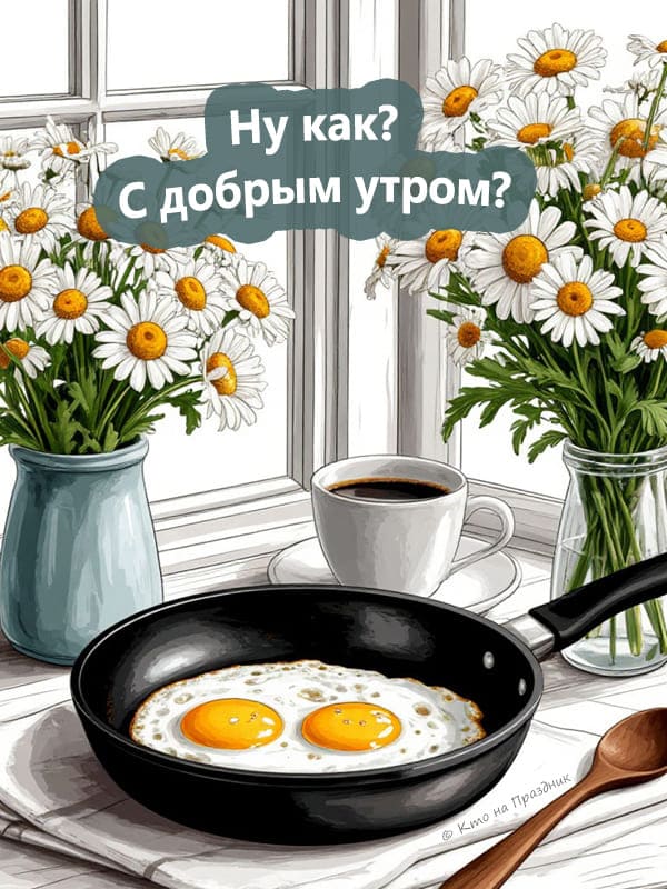 Красивая открытка с добрым утром, на иллюстрации утренний завтрак с цветами, на столе стоит чашка с кофе, сковорода с двумя жареными яйцами, а также ваза с ромашками, а на заднем плане видно окно.