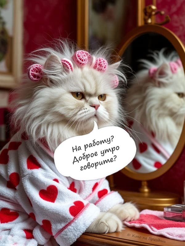 На утренней картинке она же открытка для поздравления с новым днём, изображена недовольная белая кошка, которая сидит перед круглым зеркалом в белом банном халате с сердечками, да ещё и в бигудях.