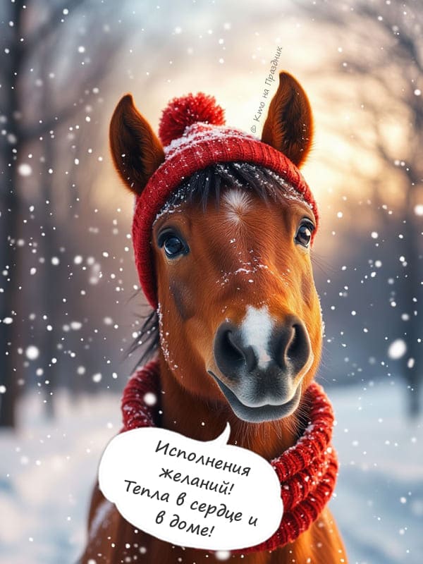 Картинка на которой лошадь с коричневой шерстью которая стоит на фоне зимнего пейзажа, на голове у лошади надета красная шапка с помпоном, а на шее красный шарф, снег падает вокруг создавая атмосферу зимнего волшебства. Это открытка является новогодним поздравлением, символизирующей тепло, уют и исполнение желаний в преддверии праздника.