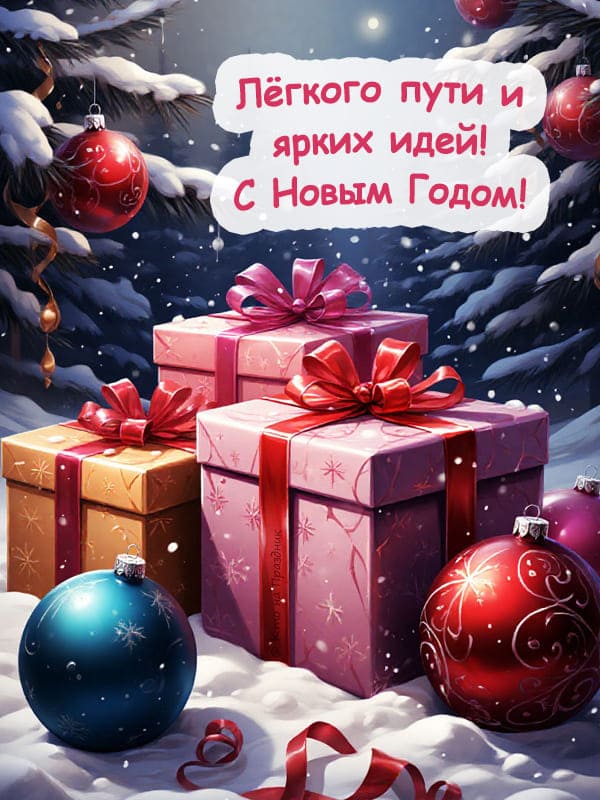 Очередная красивая новогодняя открытка на которой расположены три подарочные коробки, украшенные яркими лентами, на заднем плане видна заснеженная елка, украшенная красными и синими шарами, а фон открытки выполнен в зимних тонах, создавая атмосферу праздника и волшебства.
