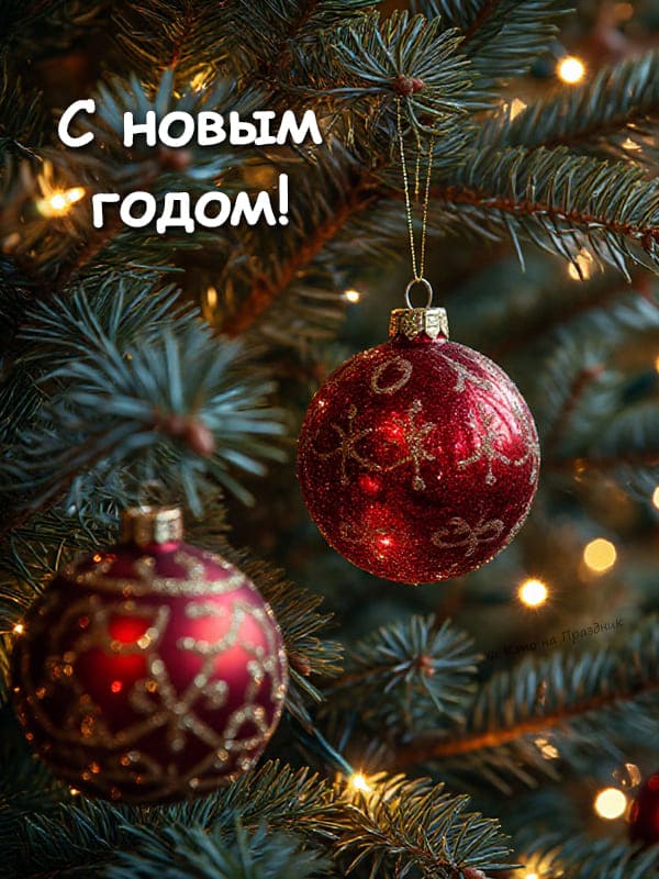 Новогодняя открытка на которой расположены ветки зелёной, большой ёлки,которые украшенны красными шарами с золотистыми узорами и золотистыми огоньками, создающими праздничное настроение, а в верхней части открытки на фоне елочных веток расположена надпись "С Новым годом!"