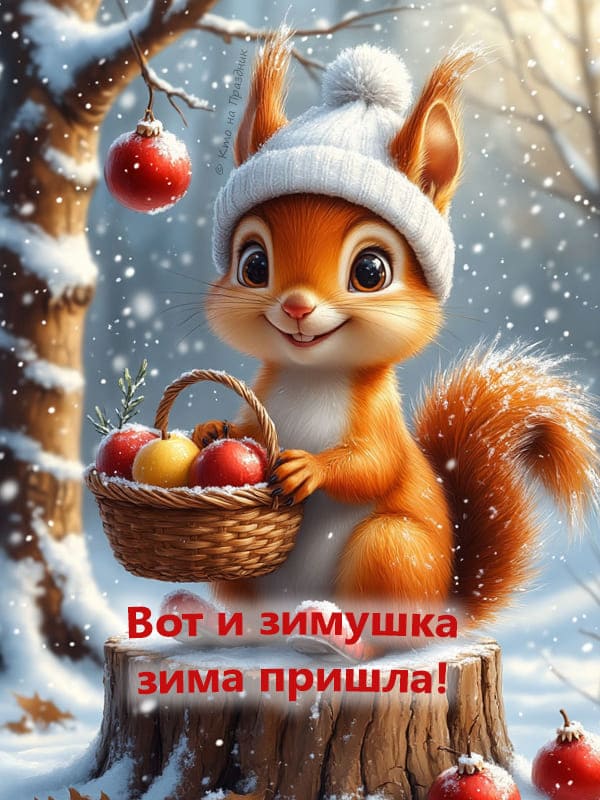 Зимняя открытка для холодного времени года на которой представлен персонаж весёлая белочка в зимней шапке которая сидит на пеньке и держит корзину с фруктами. Вокруг него снежный пейзаж, а на ветках деревьев висят красные шары, на картинке также присутствует надпись: "Вот и зимушка-зима пришла!"