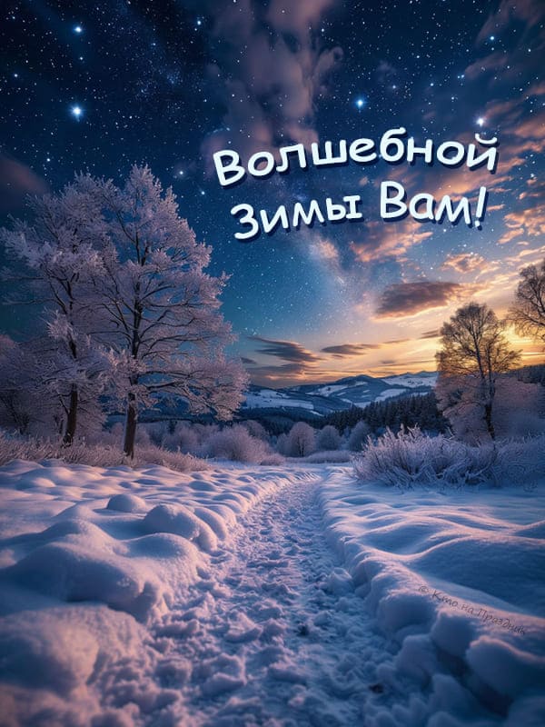 На картинке изображена зимняя сцена с заснеженным пейзажем деревьями и звездным небом, на переднем плане видна тропинка, ведущая к лесу, эта открытка передает атмосферу зимней сказки и подходит для поздравления с Новым годом или Рождеством.