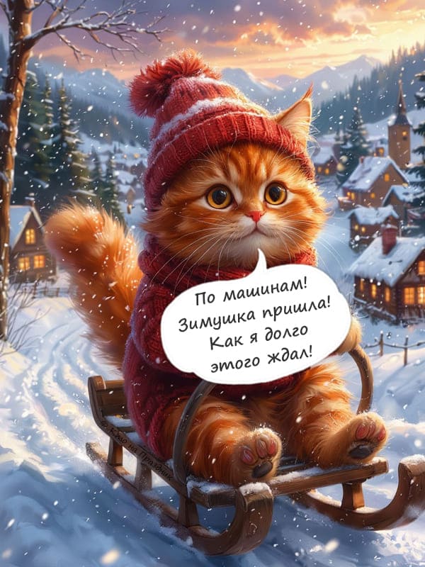 На открытке нарисован рыжий кот в красной шапке и свитере, который сидит на санках, он выглядит довольным и улыбается, на фоне виден зимний пейзаж с заснеженными деревьями и домами, а также снежные горы. Вокруг кота летят снежинки, создавая атмосферу зимнего вечера.