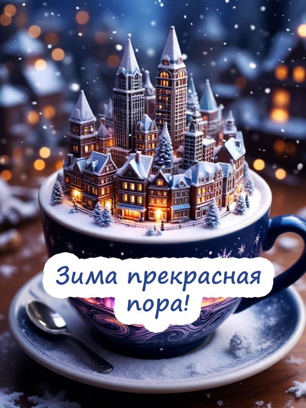 Красивая картинка в виде открытки на которой чашка с изображением зимнего города мегаполиса окруженного снегом и освещенного теплым светом.