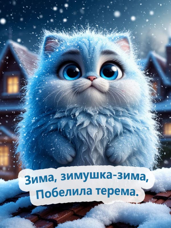 Красивая картинка в виде зимней открытки на которой котенок с пушистой шерстью сидит на фоне зимнего пейзажа, котенок выглядит как персонаж из мультфильма или компьютерной графики.