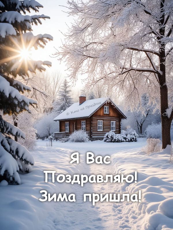 Белоснежная зимняя открытка с наступившей зимой, на которой изображён пейзаж с деревянным домом окружённым заснеженными деревьями и сугробами, солнце светит сквозь ветви деревьев создавая яркое свечение, на переднем плане виден снег покрывающий землю и ветви деревьев.