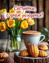 букет цветов, красивый торт и текст стихотворения на фоне разноцветных воздушных шаров